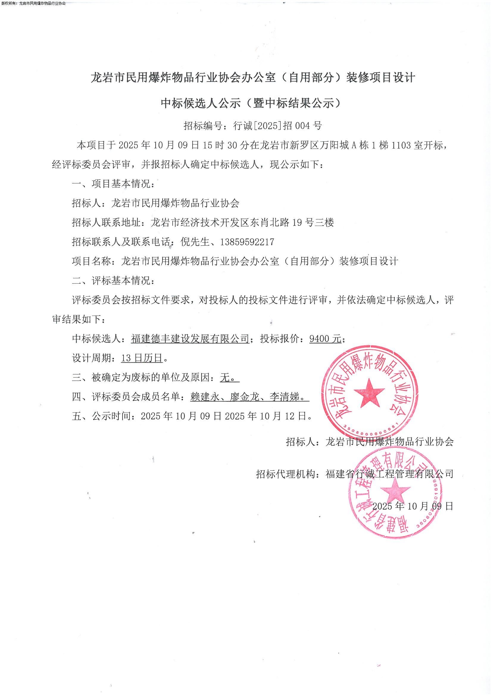 龙岩市民用爆炸物品行业协会办公室(自用部分)装修项目设计中标候选人公示(暨中标结果公示)