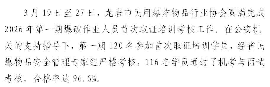 龙岩市民爆协会圆满完成2026年第一期爆破作业人员首次取证培训工作